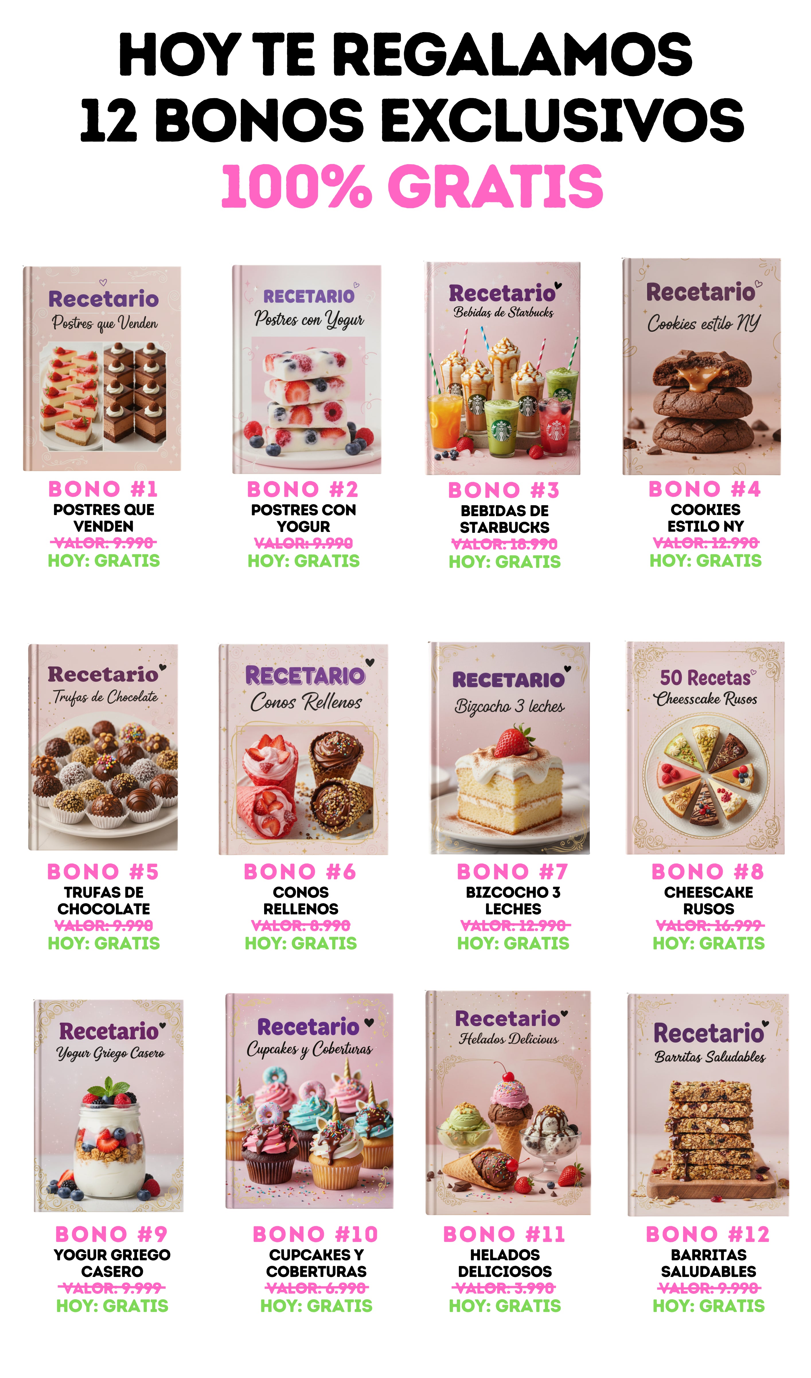 SÍ. TE LLEVÁS 12 BONOS EXCLUSIVOS GRATIS CON RECETAS Y RECURSOS EXTRA PARA MULTIPLICAR TUS RESULTADOS.